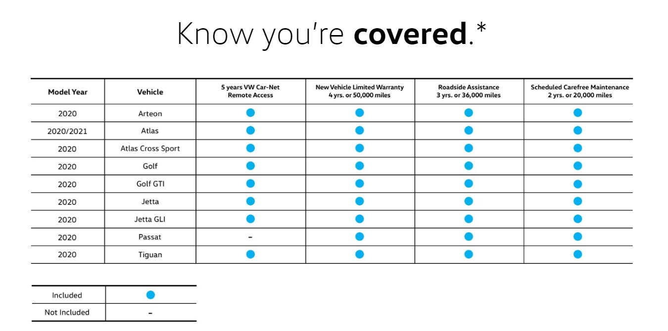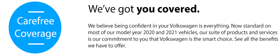 *Available on most new MY20 and MY21 vehicles. VW's Carefree Maintenance Program provides 10,000- and 20,000-mile scheduled maintenance services or scheduled maintenance services for two years (whichever occurs first) as stated in the vehicle's maintenance booklet. Does not include tire rotations, or other services or parts not specified in the owner's literature. 3 years/36,000 miles (whichever occurs first) Roadside Assistance provided by a third party. 4 years/50,000 miles (whichever occurs first) New Vehicle Limited Warranty. See owner's literature or dealer for warranty, maintenance program, and roadside assistance details, exclusions, and limitations. Car-Net Remote Access services require cellular connectivity, GPS signal, and acceptance of Terms of Service (services not available on MY20 Passat). Not all services and features are available on all vehicles. Other Car-Net services require a trial or paid subscription. See additional important information at www.vw.com/carnet